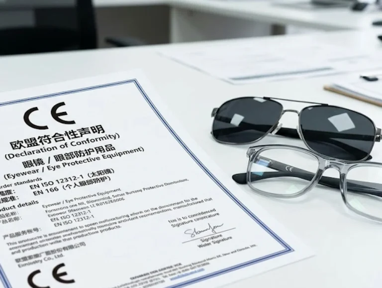 CE covers UV protection, optical clarity, mechanical strength, material safety and surface quality. EN ISO 12312-1 extends additional requirements for sunglasses.